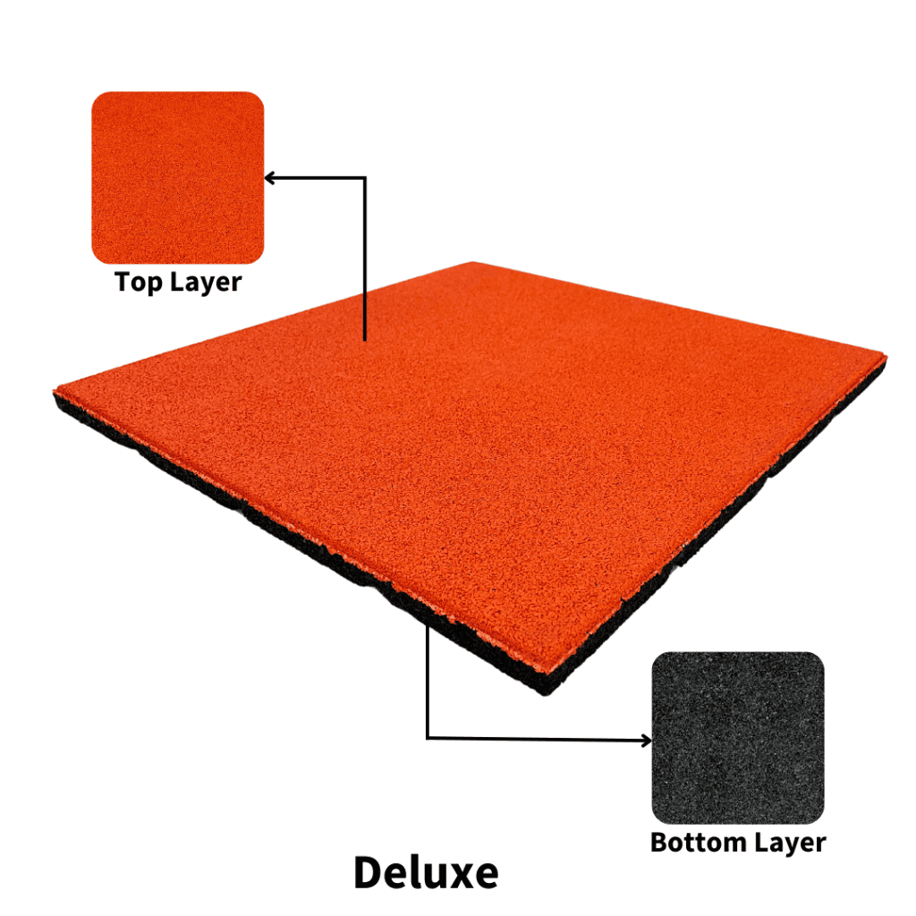 Deluxe rubber mats or EPDM mats expertly crafted with a top layer of full EPDM and a sturdy black SBR base. This premium design blends exceptional durability with comfort and style. The EPDM surface ensures remarkable resilience and UV protection, creating a soft, cushioned feel for any space. Meanwhile, the black SBR bottom layer delivers extra support and stability.